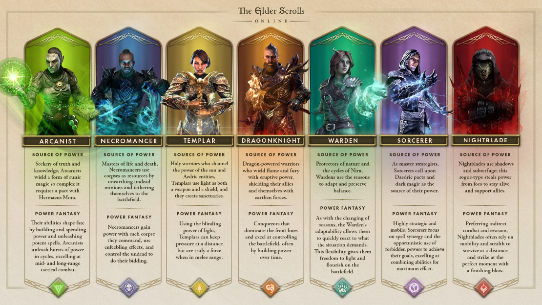 Součástí představeného konceptu je i shrnutí identity každé třídy. Vývojáři popisují odkud jejich síla pochází a jak se projevuje v boji. V aktuálním přehledu najdeme všechny hlavní třídy: Arcanist, Necromancer, Templar, Dragonknight, Warden, Sorcerer a Nightblade.