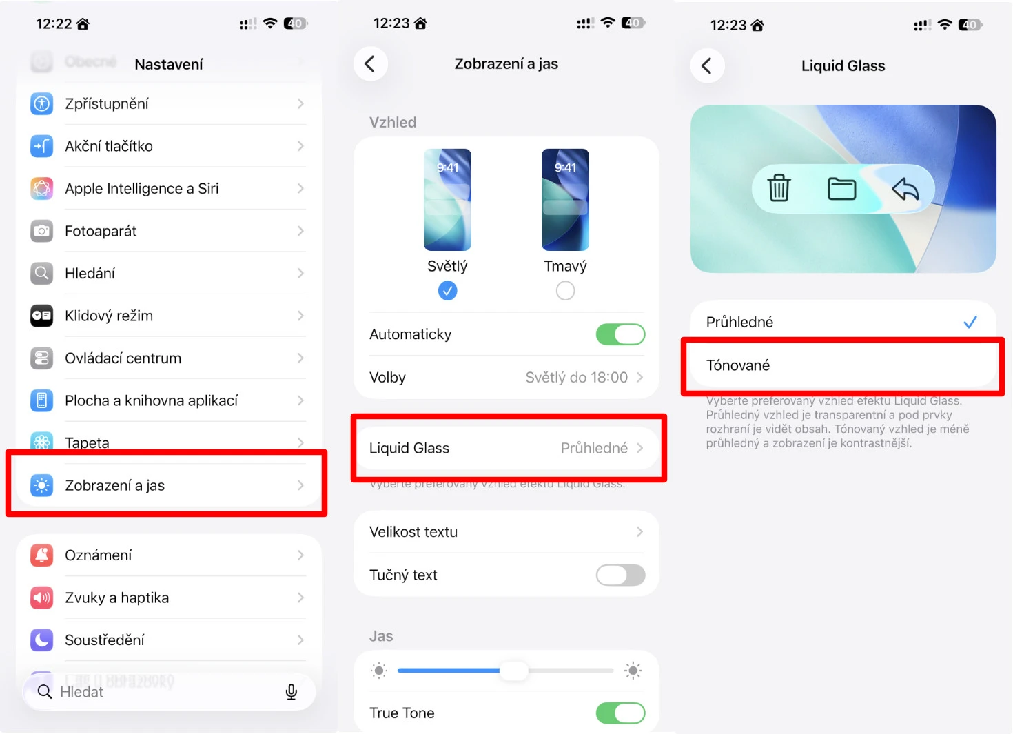 Pokud ještě nevíte, kde tuto změnu provést, jděte do Nastavení – Zobrazení a jas – Liquid Glass – a změňte volbu Průhledné na Tónované.